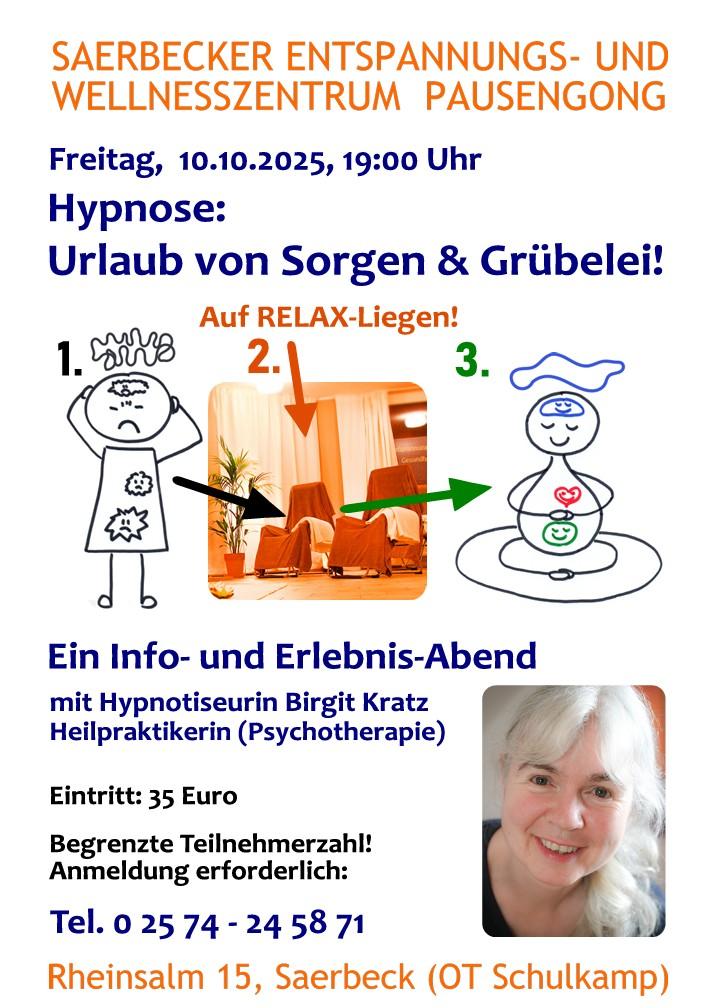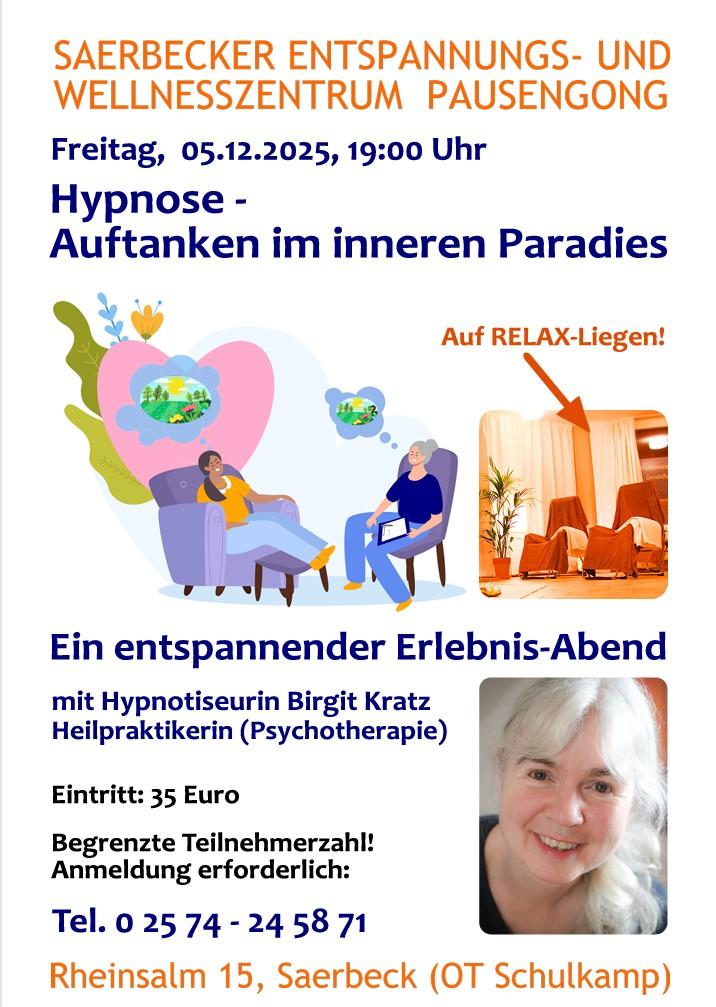 Hypnose-Erlebnisabende mit Birgit Kratz, Hypnotiseurin und Heilpraktikerin (Psychotherapie): Dienstag, 10.10. und Montag, 16.10.2023 jeweils 19 Uhr im Saerbecker Entspannungs- und Wellnesszentrum Pausengong, Rheinsalm 15.